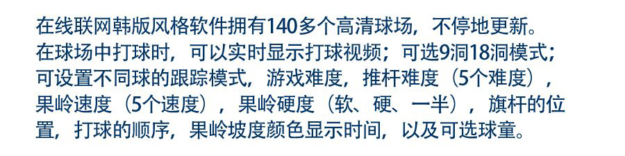 在球場(chǎng)中打球時(shí),可以實(shí)時(shí)顯示打球視頻;可選9洞18洞模式;可設(shè)置不同球的跟蹤模式,游戲難度,推桿難度(5個(gè)難度),果嶺速度(5個(gè)速度),果嶺硬度(軟、硬、一半),旗桿的位置,打球的順序,果嶺坡度顏色顯示時(shí)間,以及可選球童。