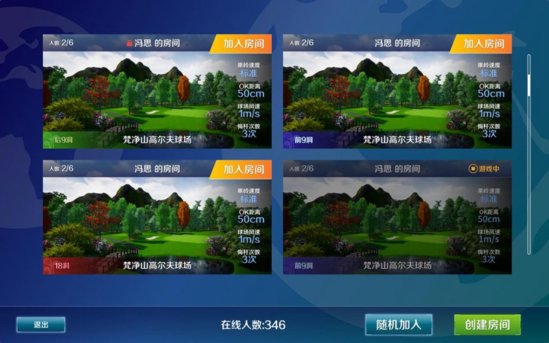 實時視頻對戰(zhàn),一人創(chuàng)建房間,多人加入,無論你身在何處,只要是中通數(shù)字高爾夫室內(nèi)高爾夫模擬器設備即可實現(xiàn)異地實時對戰(zhàn)約球,酣暢的享受競技的快感。