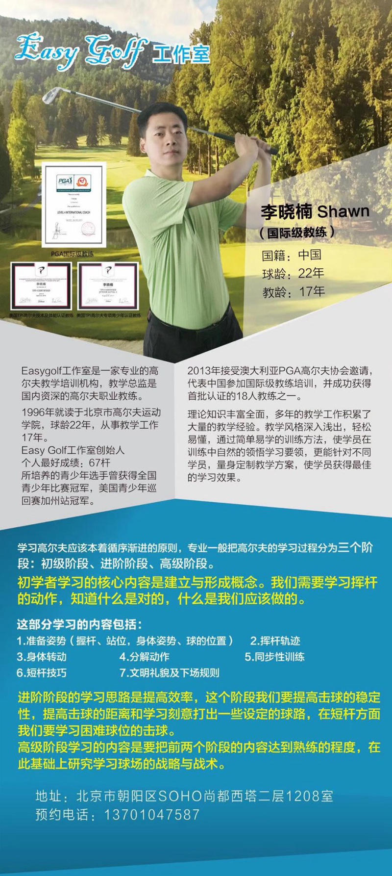 Easygolf工作室,以推出精品高爾夫教學(xué)課程為主要經(jīng)營(yíng)項(xiàng)目,并結(jié)合高爾夫運(yùn)動(dòng)文化特點(diǎn),為球友打造高品質(zhì)健康的交流平臺(tái)。