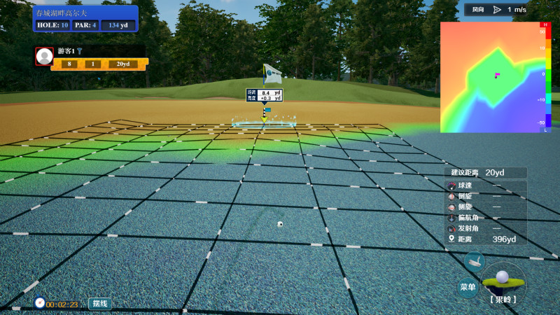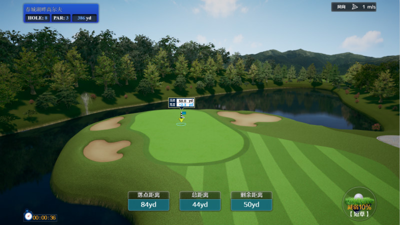 打開球場每洞擊球前會有語音介紹,比如春城湖畔高爾夫球場第1洞,整體預(yù)覽球道的同時(shí)會告訴你:386碼,標(biāo)準(zhǔn)桿4桿的球洞。
