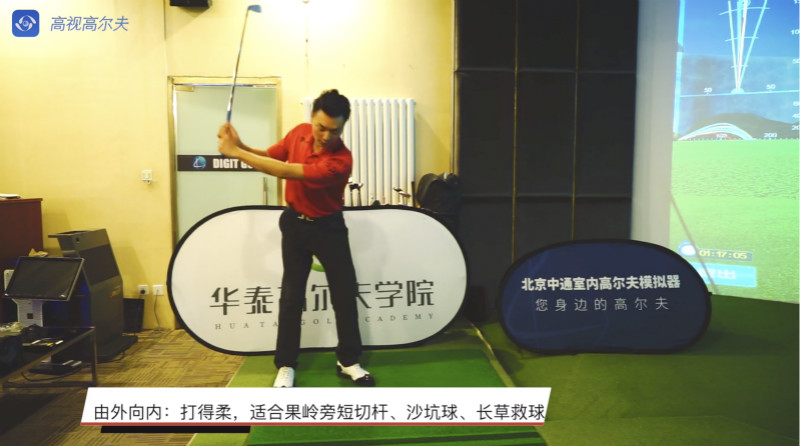 由外向內(nèi)揮桿的特點(diǎn):打得柔,容易停下來(lái),比較適合果嶺旁邊短切桿、沙坑球、長(zhǎng)草救球。