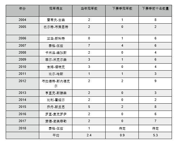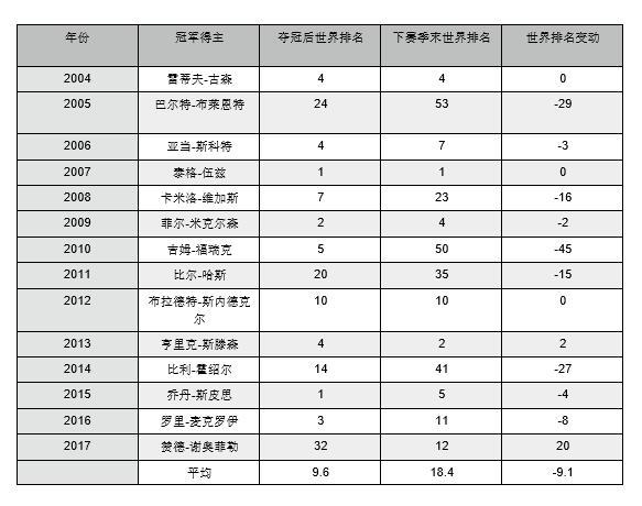 自2004年以來贏得巡回錦標(biāo)賽冠軍的每位高爾夫球手在接下來的賽季中都贏得了較少的PGA巡回賽事,盡管值得注意的是,在2007年伍茲奪冠之后,他的2008賽季在膝蓋手術(shù)后被縮短了。他只參加了6場PGA巡回賽,贏得了4場比賽,其中包括在多利松(Torrey Pines)舉行的美國公開賽,并在所有賽事中排名前10。